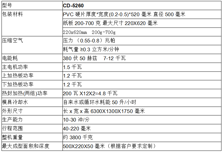 CD-5260 全自動紙塑包裝機(jī)是我公司在DZP-500系列之后推出的新一代高效高產(chǎn)能設(shè)備。由泡殼成型機(jī),封口機(jī)組成,PLC系統(tǒng)同時(shí)操控,伺服電機(jī)驅(qū)動,故障率低,操作簡單。相比上一代設(shè)備,泡殼成型面積及深度大大提高。